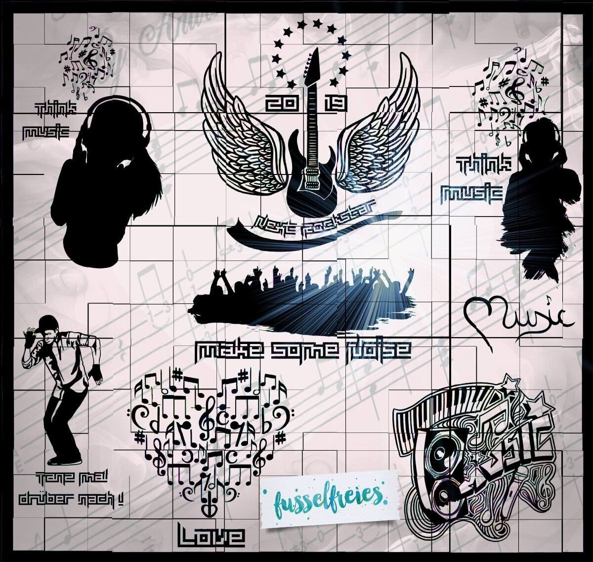 - Schriftzüge (in 2 Varianten): - Music was my first love - Musik an - Welt/Kopf aus - Music is my life - Musik ist Balsam für die Seele - Ich bin nicht alt, ich bin Retro - Windelrocker - Kitarocker - Fühl den Beat - Musik ist mein Herzschlag - Rhythm is my life - Rhythmus ist mein Leben - Feel the Rhythm - Let´s make some noise - Drum&Bass - Ja, das muss so laut sein! - Läuft bei mir - Lass mich mal machen Ich hab das schonmal gemacht - Drop the bass - Skip the beat - Mach lauter - Voll auf die zwölf - Play the f****** music - A star is born - Please don´t stop the music - Chill & Musik Zone - Es knistert so schön - I close my eyes and count to 4 - Music is my heartbeat - Akkord Junkie - Can't hear ya, my music is too loud!Make some noise, Music, Next Rockstar, Love, Tanz mal drüber nach!, Think Music, Zahlen